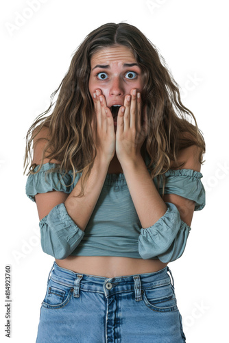 Young woman with shocked expression and hands covering face isolated on transparent background png