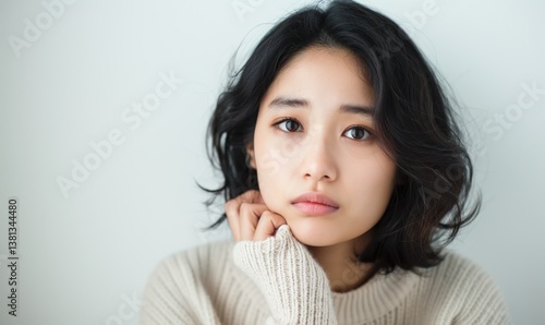Young woman with soft features and wavy hair looking thoughtfully at the camera in a cozy sweater, expressing emotions and vulnerability, portrait photography concept
