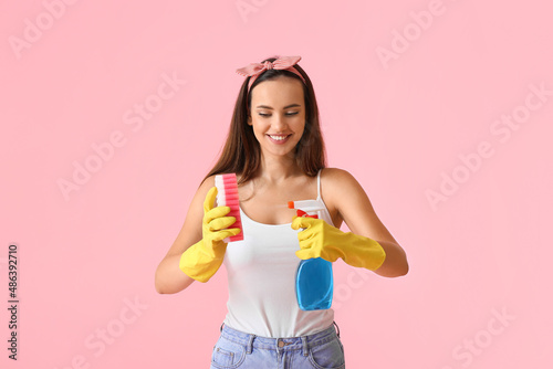 Young woman with sponge and detergent on color background
