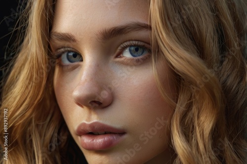 young woman with striking facial features, fair skin, caramel blonde hair, blue eyes, long lashes, dark background