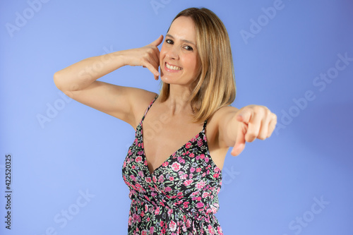Young woman with summer dress over isolated purple background making phone gesture. Call me back sign