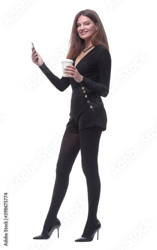 young woman with takeaway coffee reading SMS on her smartphone.