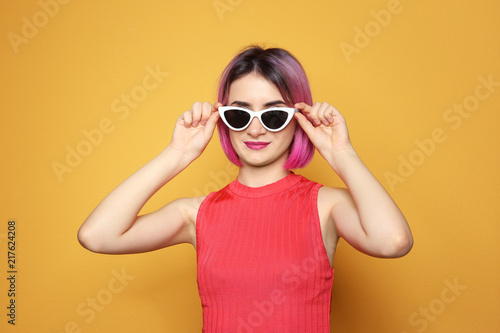 Young woman with trendy hairstyle wearing sunglasses against color background