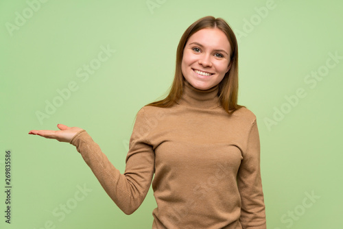 Young woman with turtleneck sweater holding copyspace imaginary on the palm to insert an ad