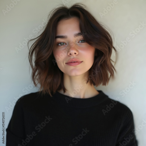 Young woman with wavy hair poses. Brunette model wears black sweater. Stylish, confident look with natural appearance. Beauty, fashion photography, studio portrait. Neutral backdrop.