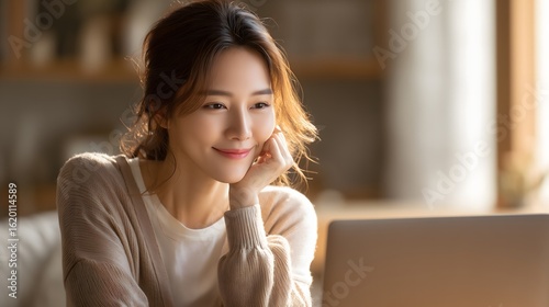 Young Woman Working From Home: Cozy Home Office Setup with Modern Laptop and Space for Text