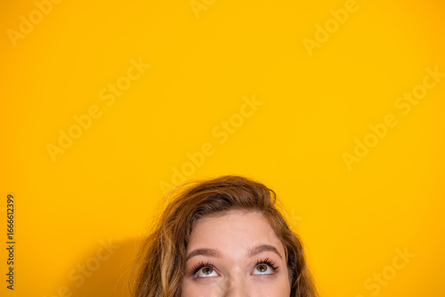 Young Woman's Eyes Looking Up on Bright Yellow Background, Dreamy Expression, Stylish Appeal for Fun and Creativity