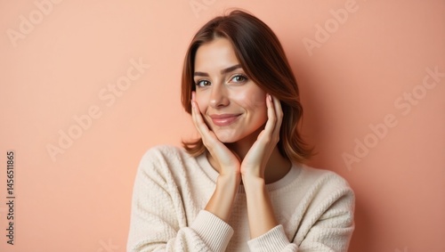 Youtube Ads. Smiling young woman with brown hair in beige sweater posi