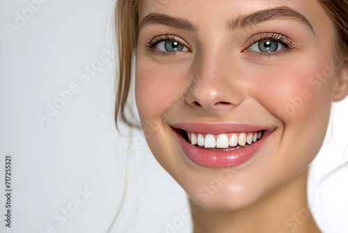 Zahnmodel mit strahlendem Lächeln und perfekten Zähnen. Hübsche Frau für Werbung beim Zahnarzt oder zur Zahnpflege.