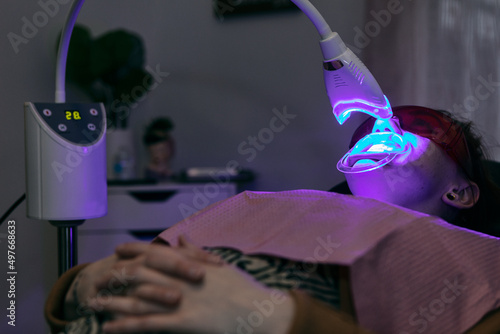 Female receiving teeth whitening procedure. Portrait of a female patient at dentist in the clinic. Teeth whitening procedure with ultraviolet light UV lamp. LED lamp for Teeth whitening procedure